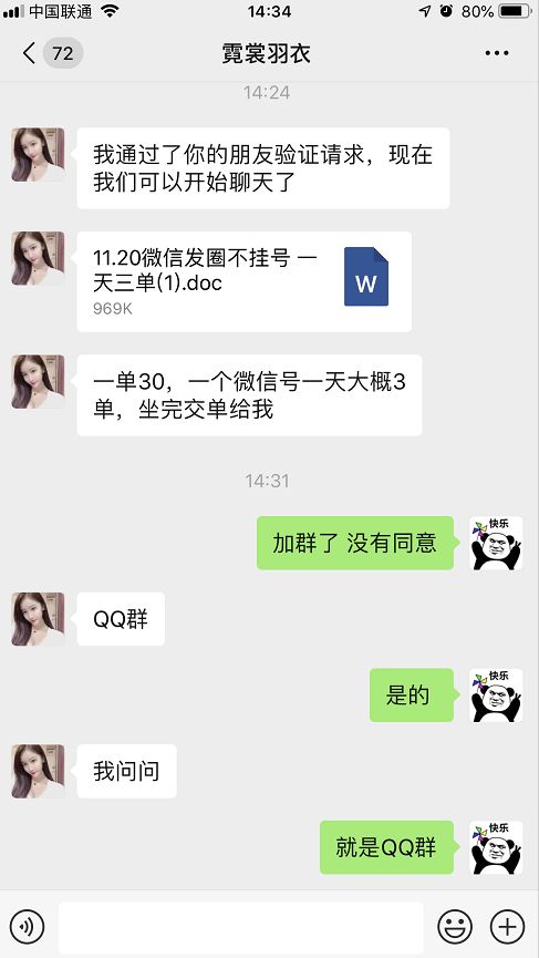 我尝试着加了他的微信,他介绍说一个微信一天能做三单,一单30,然后再给我发了详细的介绍。