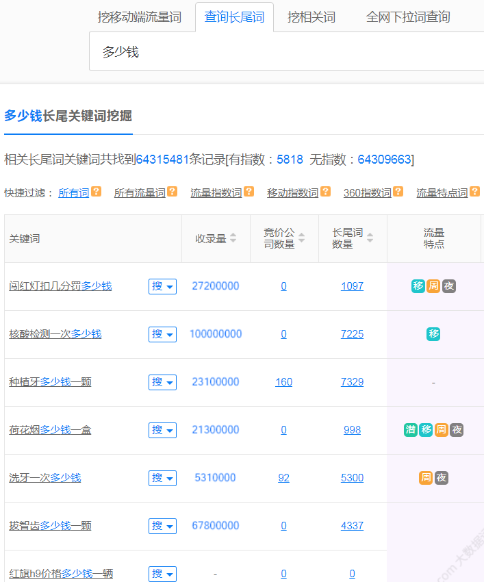 这个就简单了,直接把词根放在软件里,会挖掘到成千上万的长尾词,这些词都是我们后期要分析的词。
