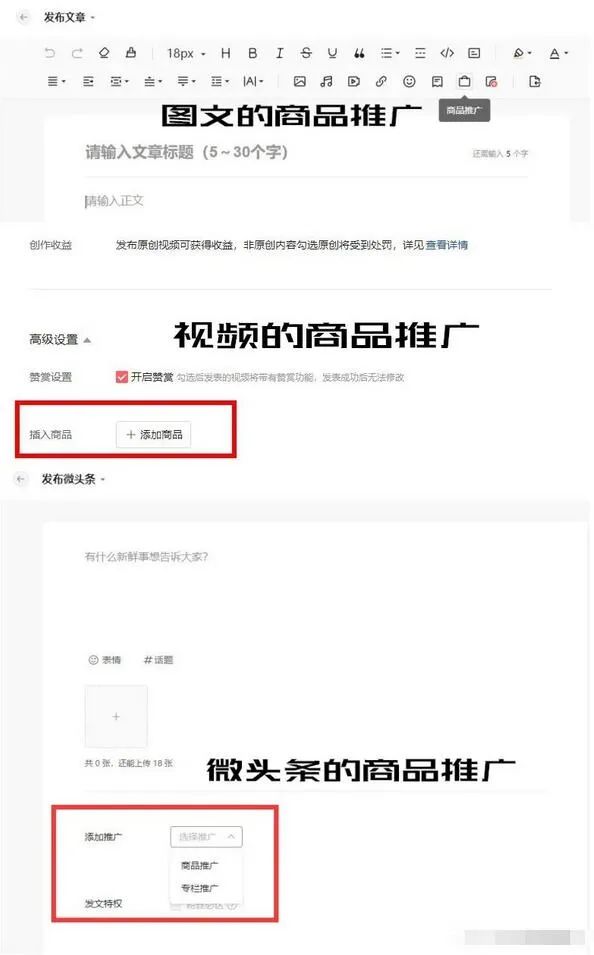 流量变现:商品功能(在文章/微头条/短视频中可以插入相关商品,赚取销售佣金)