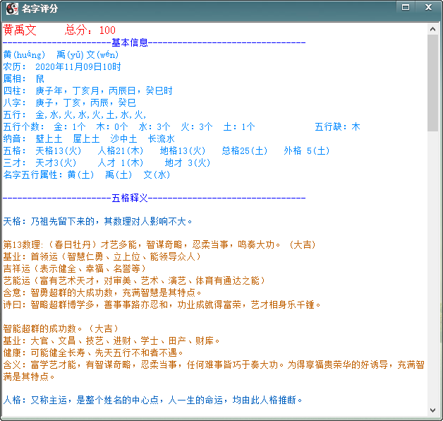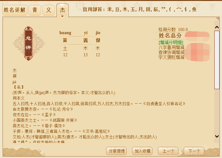 可根据姓氏、姓别、字数、生辰八字等生成名字,而且每个名字都有分析: