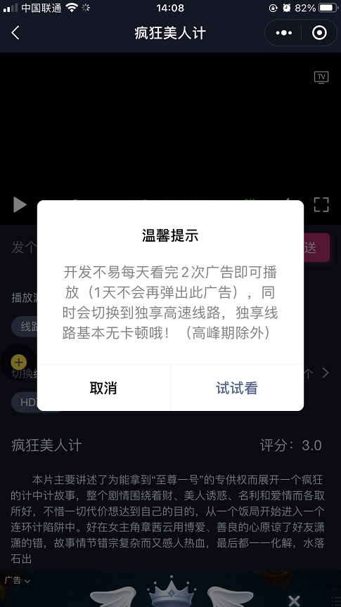 比如我扫码点开一个小程序,点击一部电影准备播放的时候,就弹出一个看广告的提示,是只有观看了广告之后,才能继续看电影。