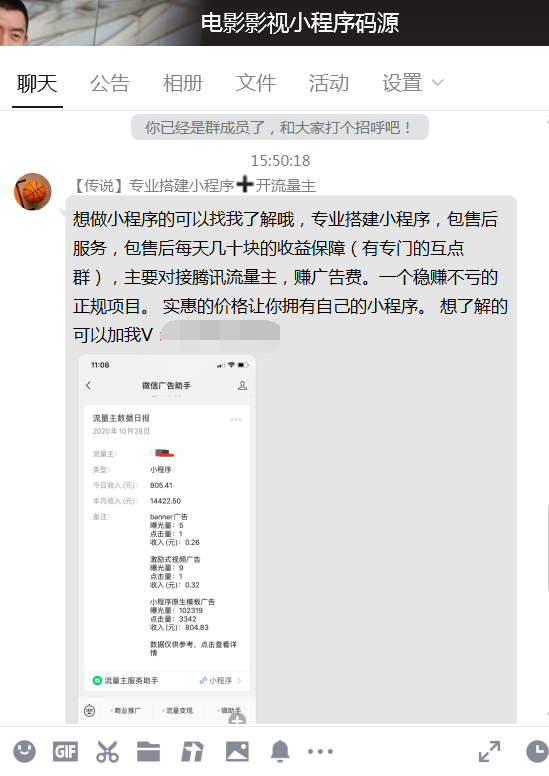 而通过推广宣传电影小程序的人,也能获得收益,那就是通过开通流量主,来获取广告变现。(不同于以往卖会员的形式,现在只要大量的推广,有人访问我们的小程序,点击了广告就可以变现)